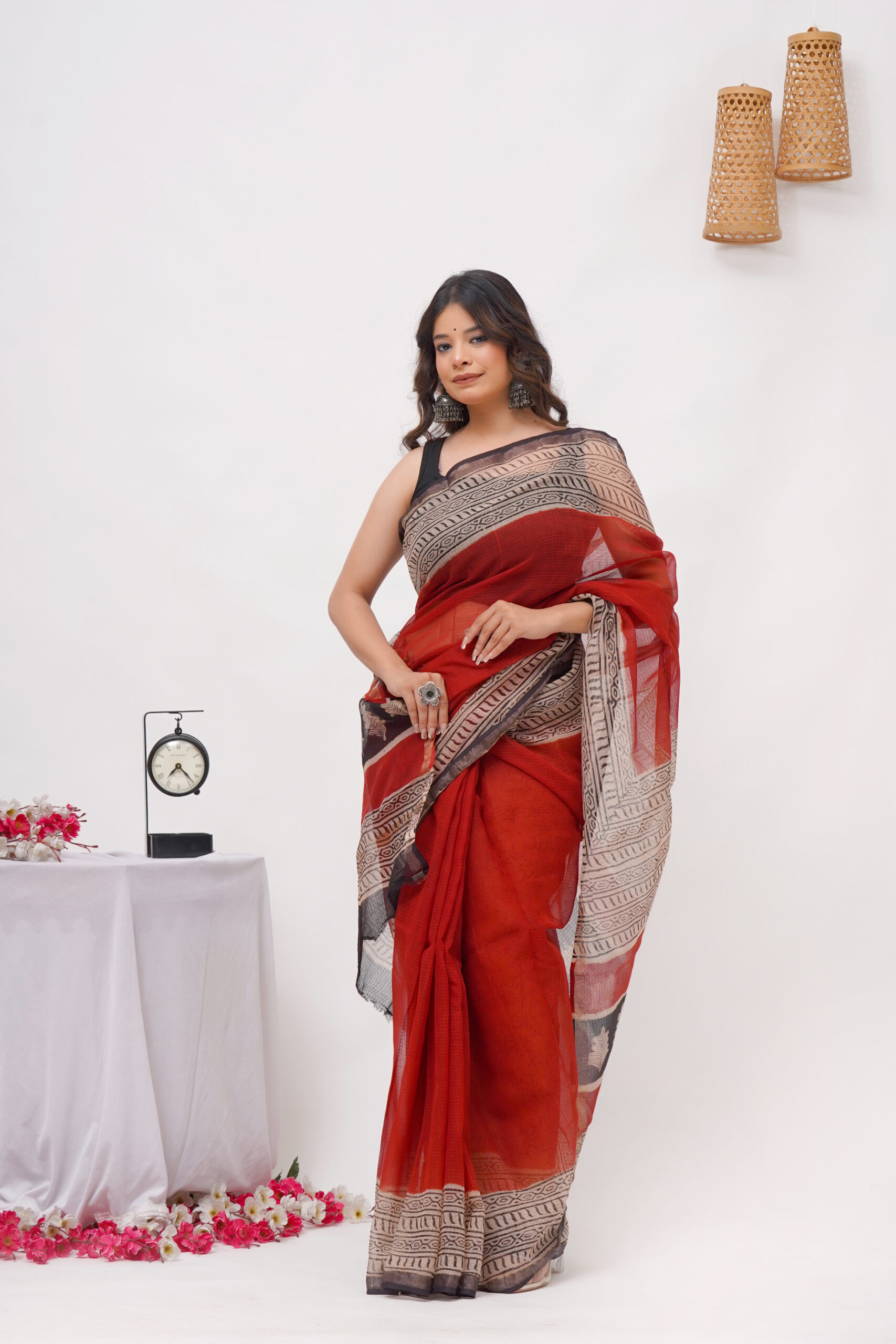 Handcrafted with timeless tradition, this Cotton Kota saree features elegant vegetable dye prints that celebrate natural artistry. Light, airy and effortlessly graceful, it offers a perfect blend of comfort and sophistication. The earthy prints on fine Kota weave make it ideal for both daily wear and festive occasions