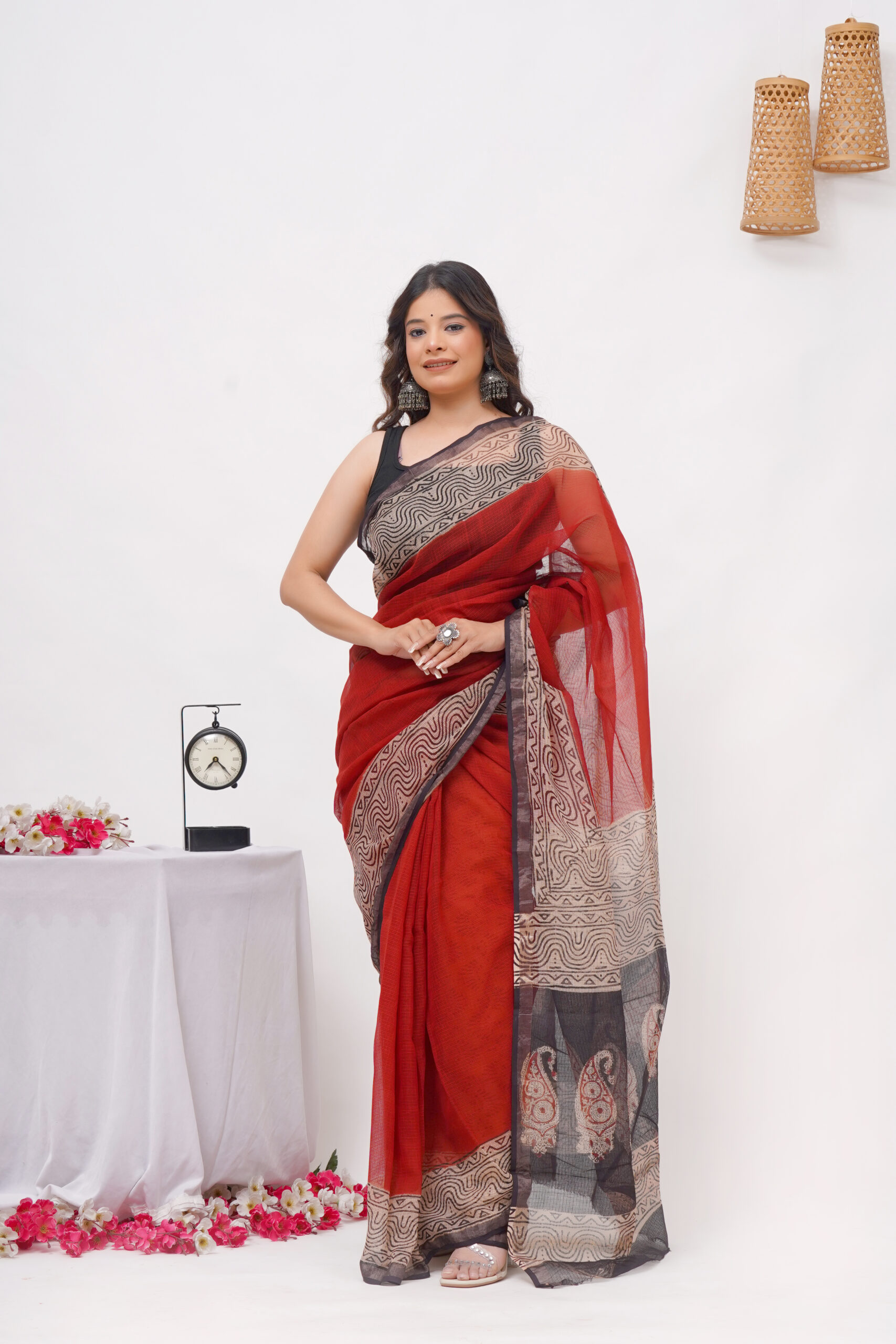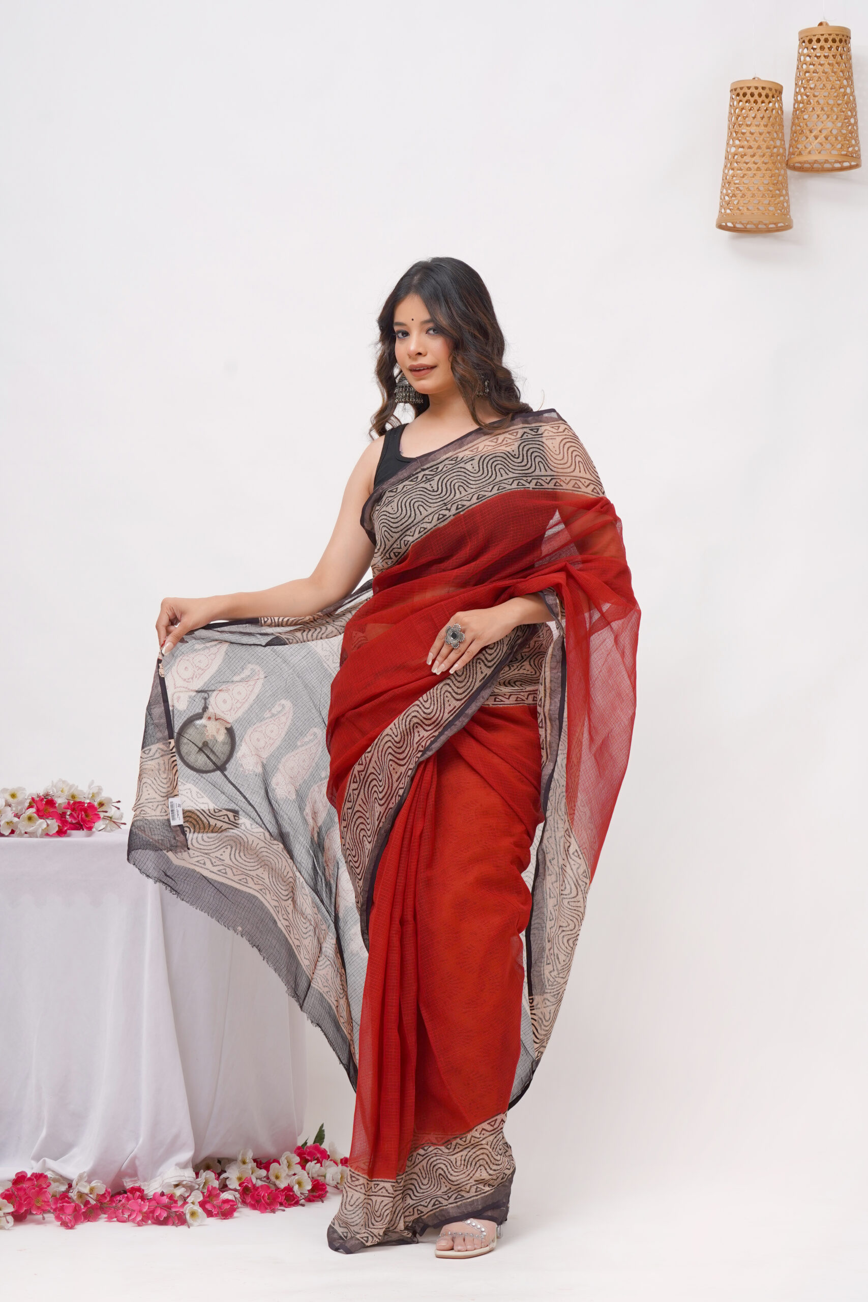 Handcrafted with timeless tradition, this Cotton Kota saree features elegant vegetable dye prints that celebrate natural artistry. Light, airy and effortlessly graceful, it offers a perfect blend of comfort and sophistication. The earthy prints on fine Kota weave make it ideal for both daily wear and festive occasions