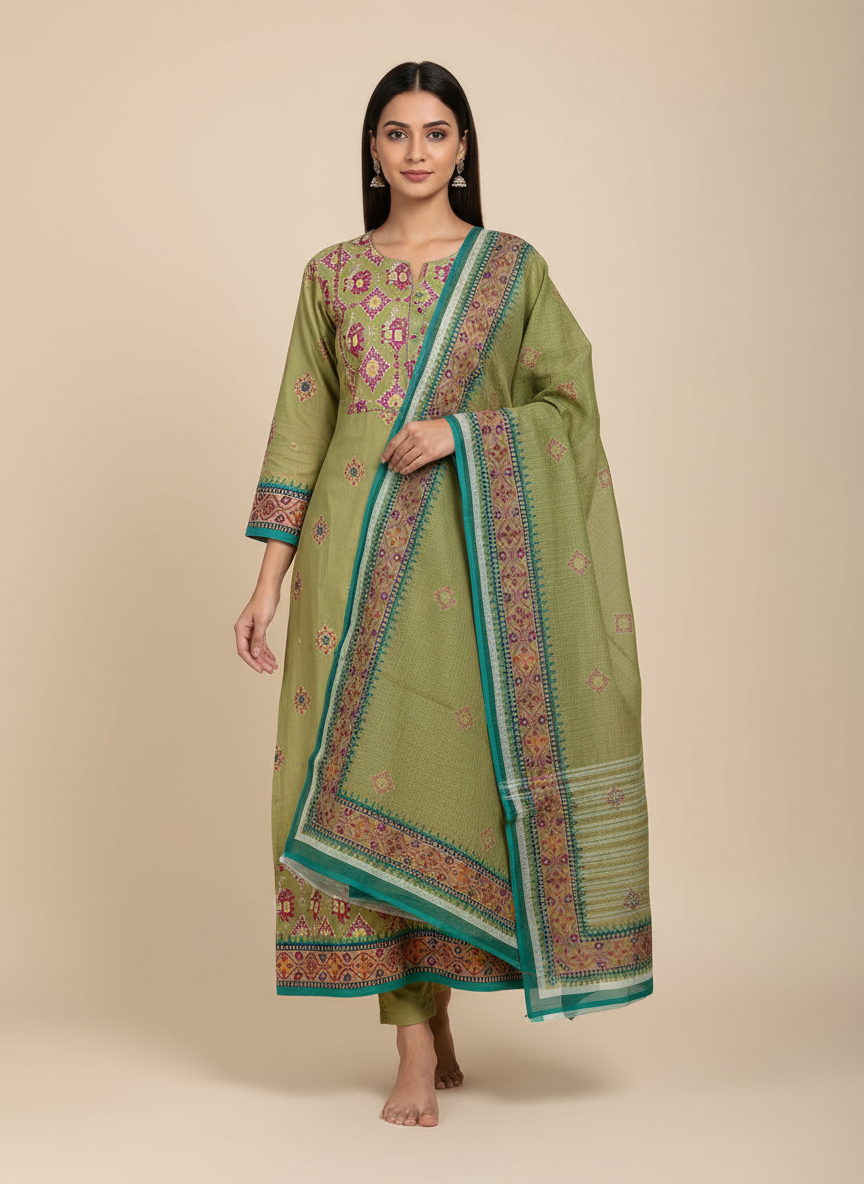 Step into everyday elegance with this beautiful Two-Piece Cotton Suit Set. Designed for ultimate comfort and timeless style, this ensemble is a must-have for your ethnic wardrobe.