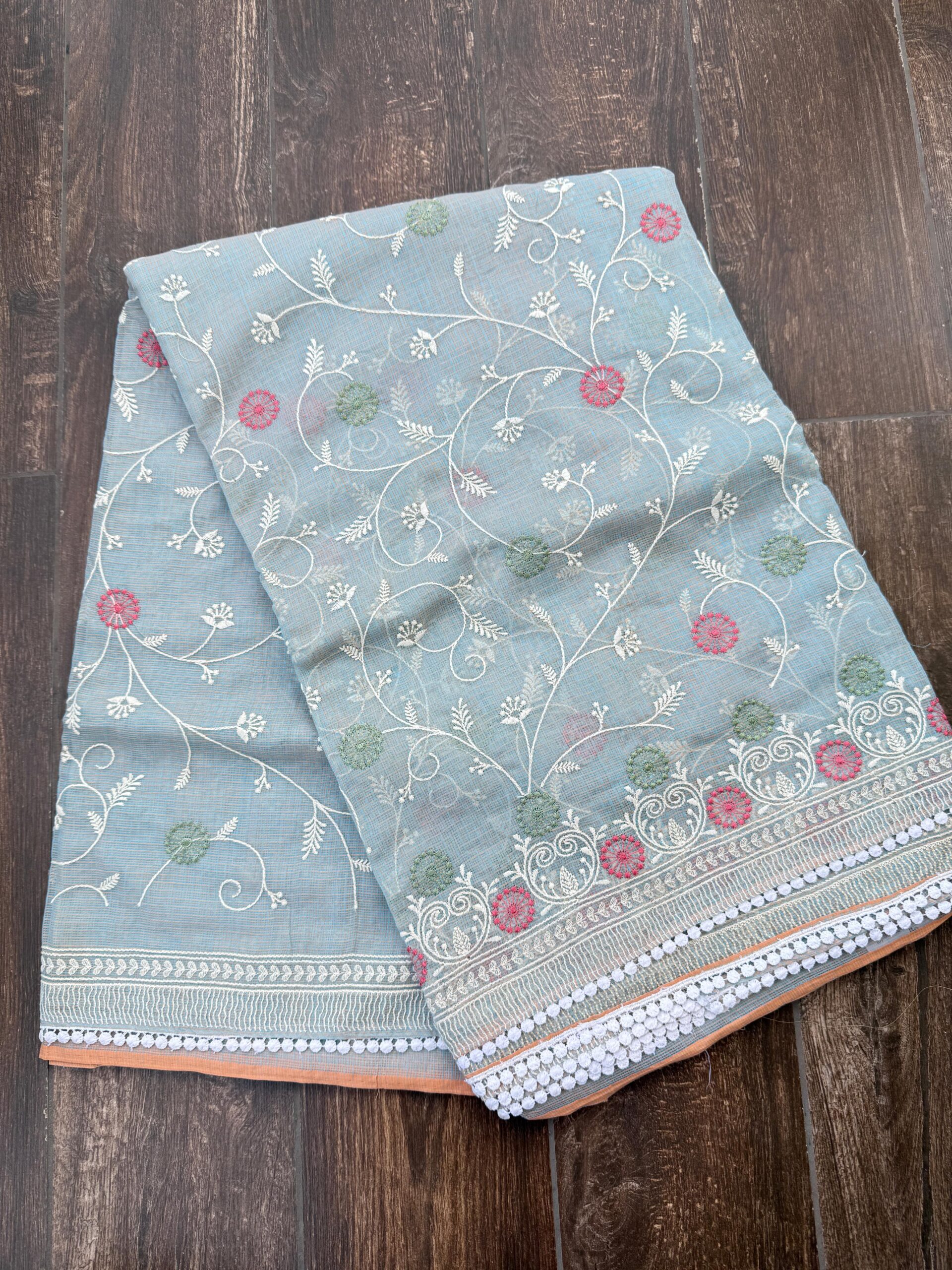 Delicate embroidery adorns the saree’s borders and pallu, adding a touch of sophistication and artistry to every fold. The intricate threadwork beautifully complements the soft, translucent weave, creating a look that’s both graceful and refined.