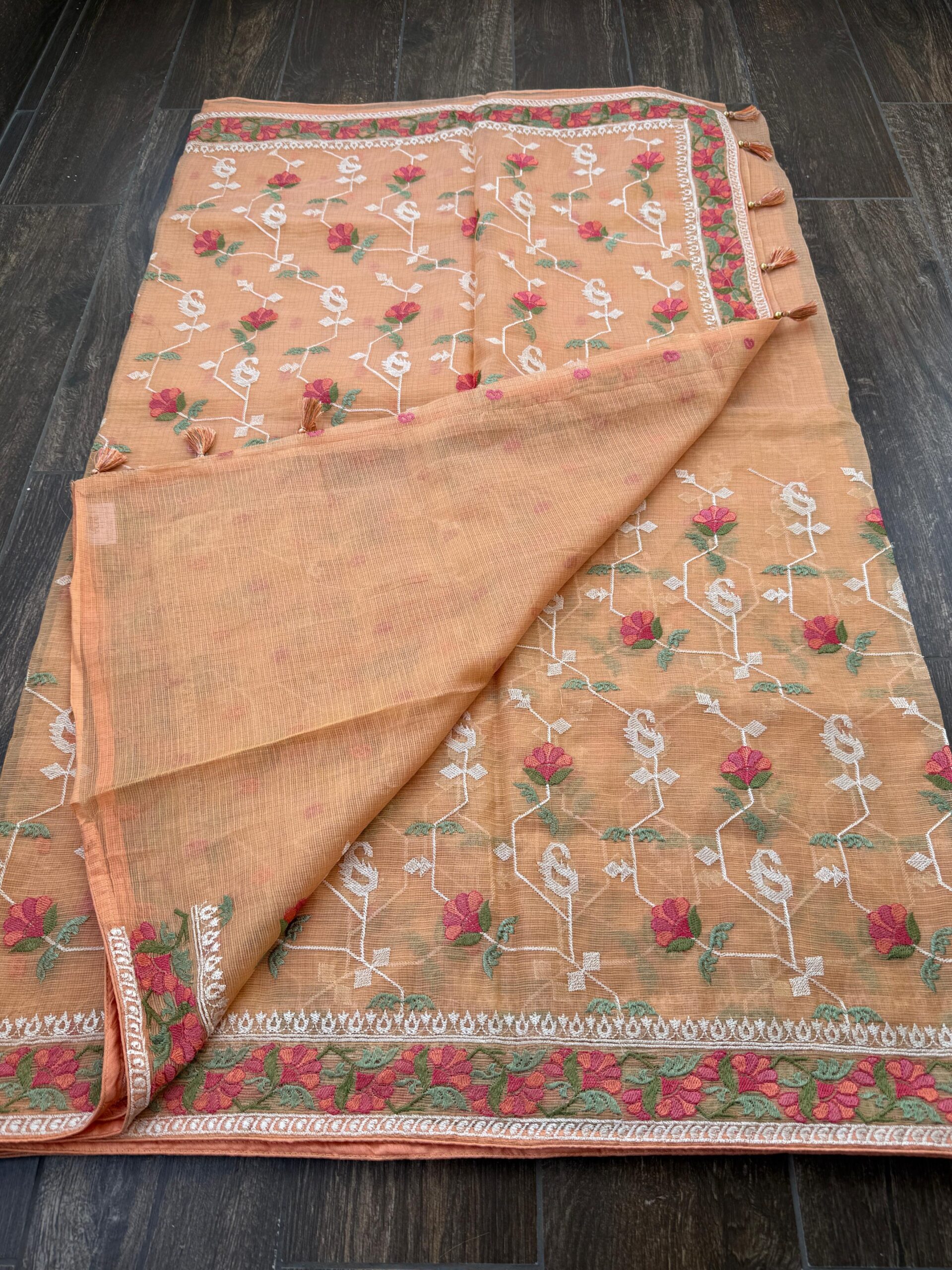 Embrace the perfect fusion of tradition and luxury with this Kota Tissue Embroidery Saree with Embroidered Blouse. Crafted from fine Kota tissue fabric, this saree showcases a gentle sheen that beautifully catches the light, giving it a refined and festive appeal.