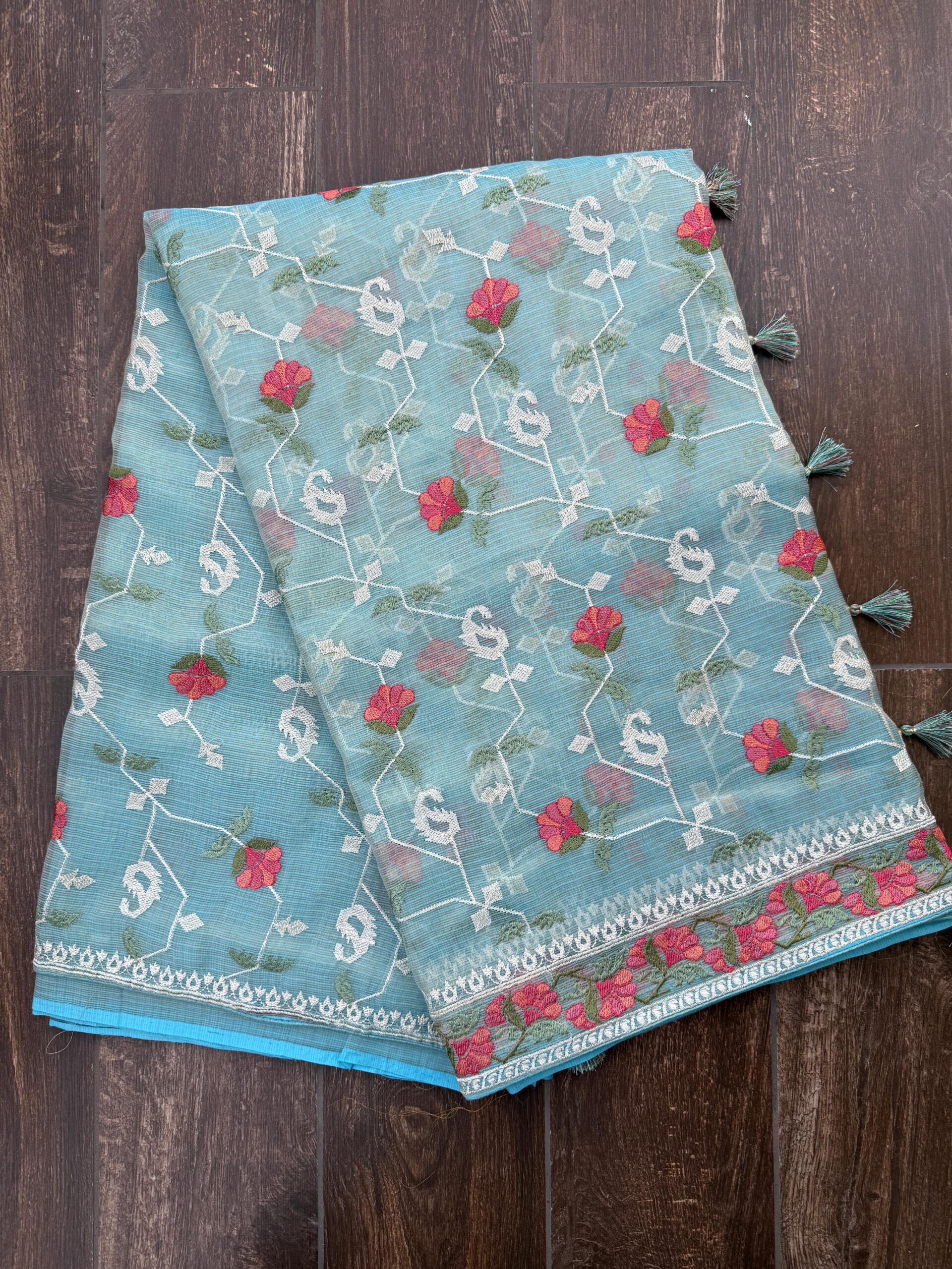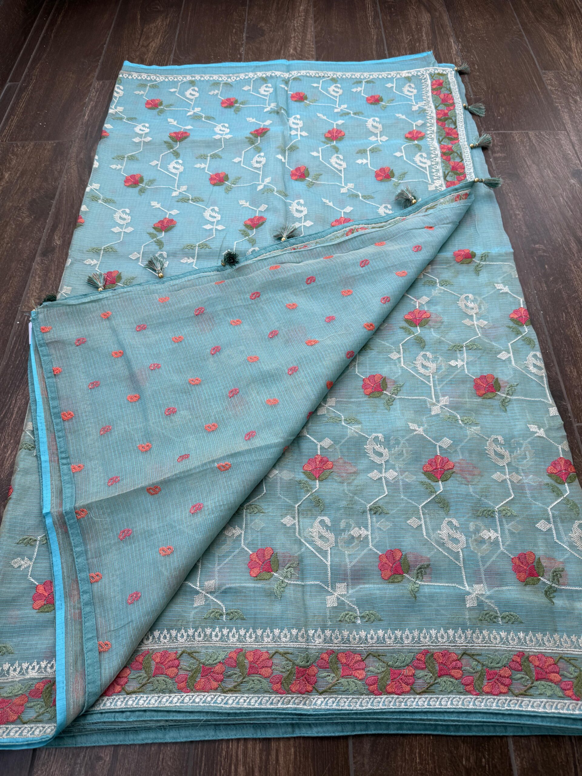 Embrace the perfect fusion of tradition and luxury with this Kota Tissue Embroidery Saree with Embroidered Blouse. Crafted from fine Kota tissue fabric, this saree showcases a gentle sheen that beautifully catches the light, giving it a refined and festive appeal.