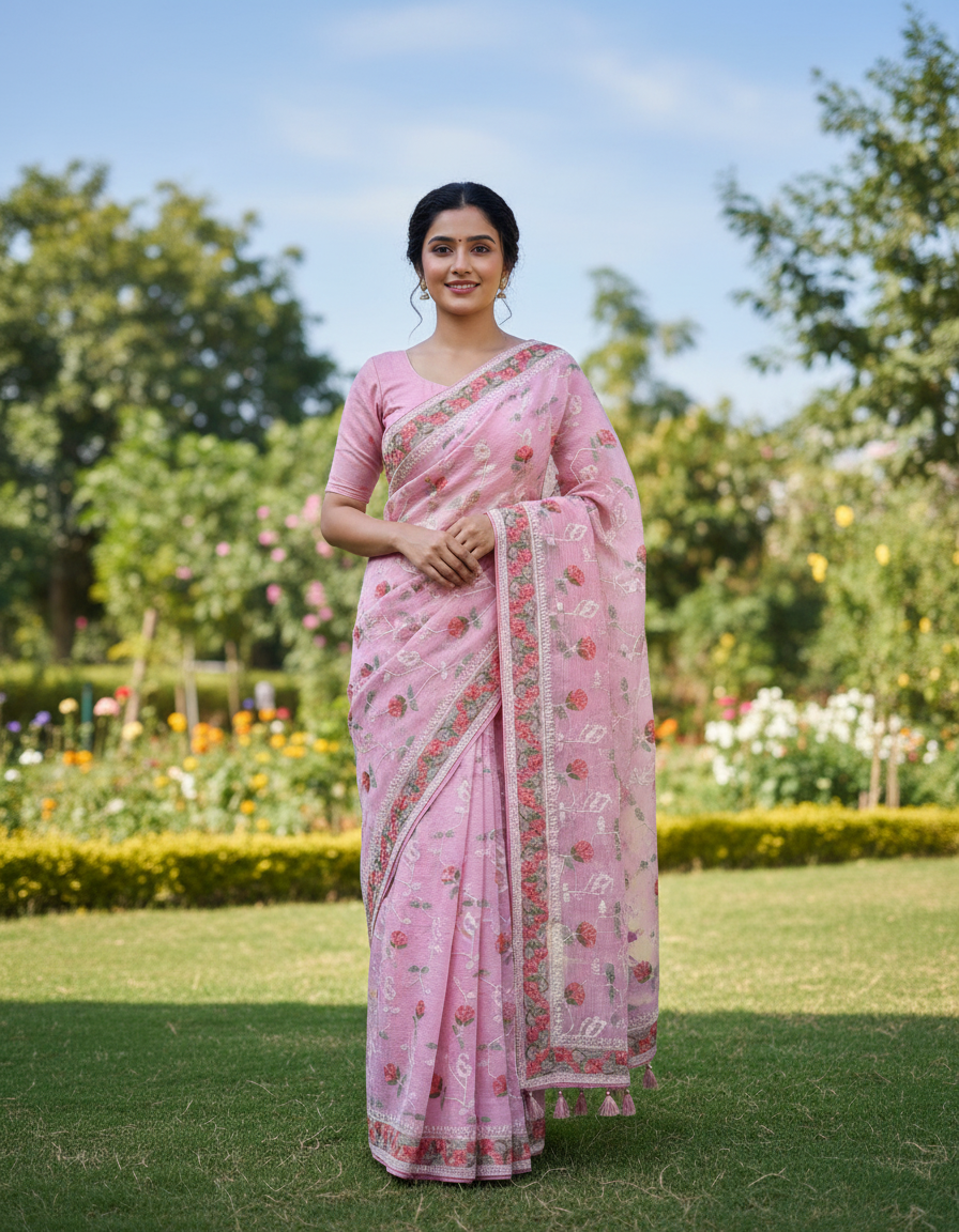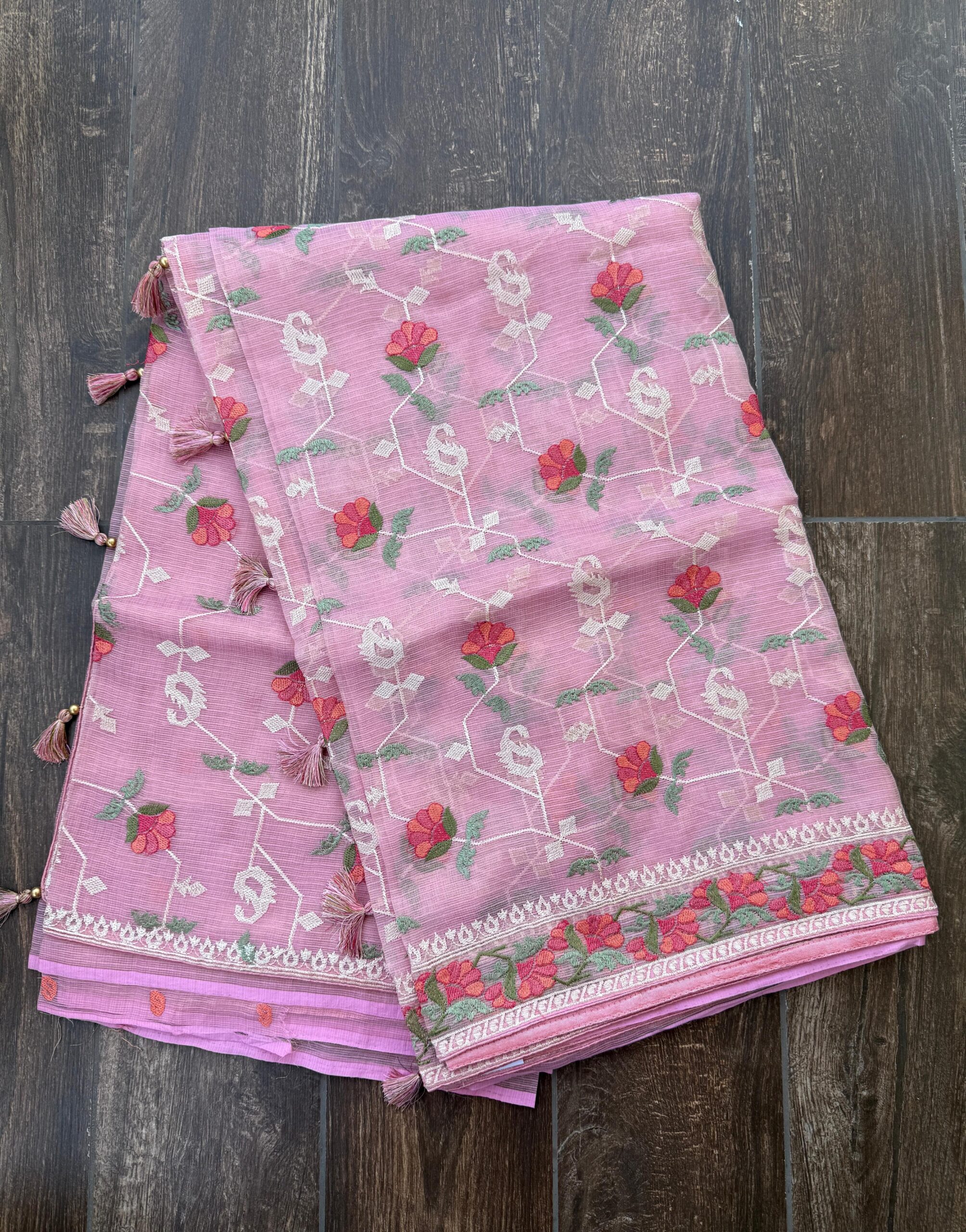 Embrace the perfect fusion of tradition and luxury with this Kota Tissue Embroidery Saree with Embroidered Blouse. Crafted from fine Kota tissue fabric, this saree showcases a gentle sheen that beautifully catches the light, giving it a refined and festive appeal.